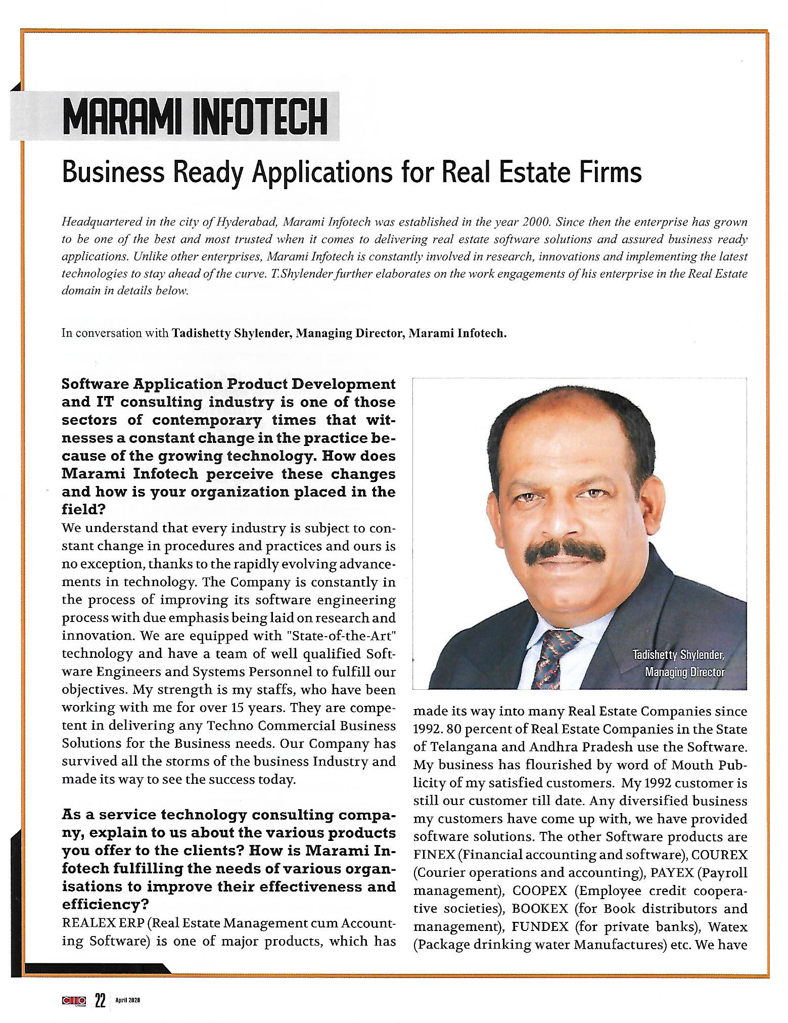 Marami Infotech Limited is a Software Application Product Development and Information Technology Consulting Enterprise, Headquartered at Hyderabad, Telangana, India. The Company was established in the year 2000 (formerly Exnora Infosys Established in 1992). Since then the company has taken large strides in developing wide range of IT applications that are in tune with the Clients' specifications. Over the years the Company has built a large clientele who are extremely satisfied with our services.